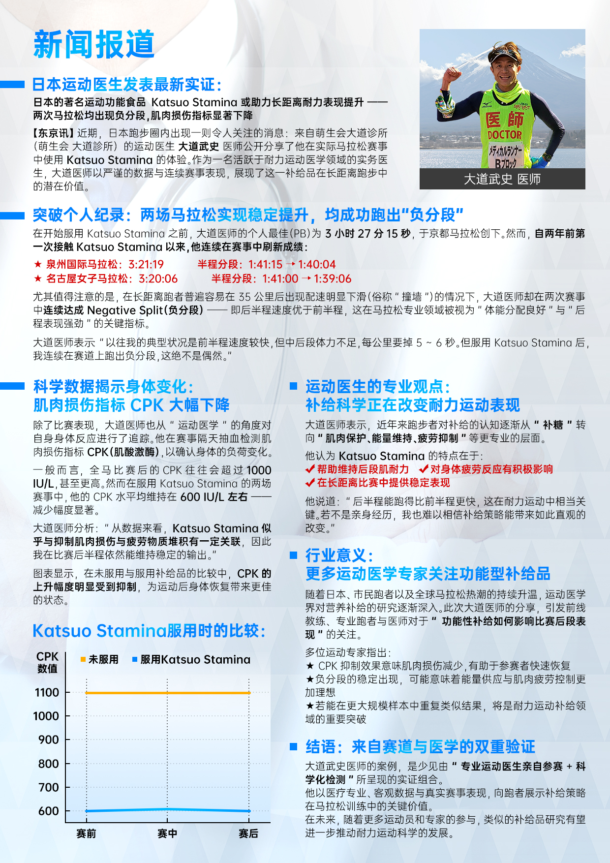 Dr. Takeshi Oomichi, a Japanese sports physician and marathoner, demonstrated the impact of Katsuo Stamina across multiple events: