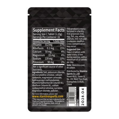 - Extended Electrolyte Supplementation With its higher concentration per dose, Elec Stamina Salt Cap provides up to twice the duration of electrolyte supplementation compared to conventional salt tablets. This means longer-lasting support for your most grueling workouts and competitions.